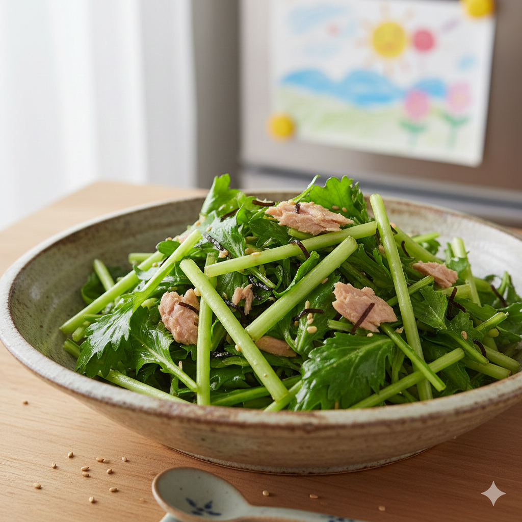 ツナの油分とごま油が春菊の葉をコーティングし、舌に直接苦味が触れるのを防ぎます。さらに塩昆布のグルタミン酸(旨味)が加わることで、野菜嫌いのお子様でも箸が止まらない「無限サラダ」に変身します。
