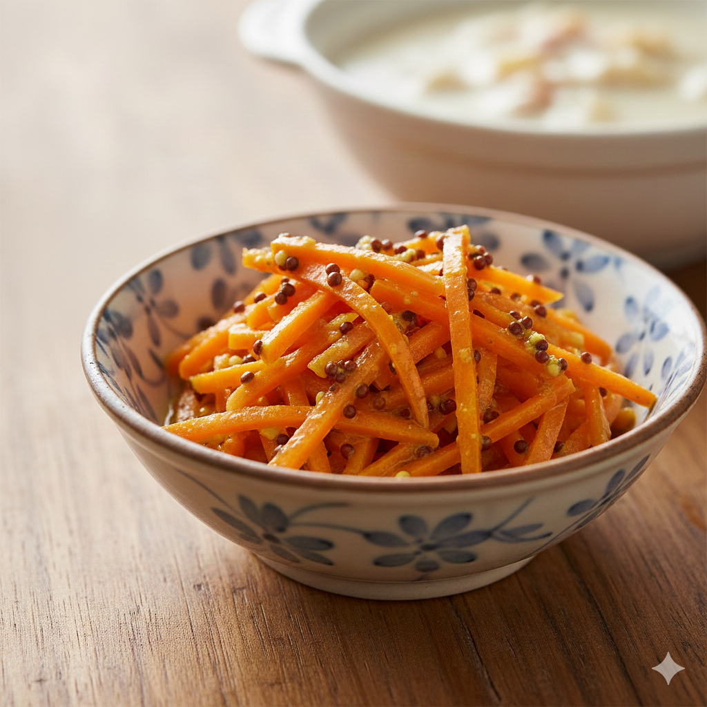 人参は加熱してから冷ます過程で味が染み込みます。熱いうちに調味料と和えることで、酸味がまろやかになり、粒マスタードの適度な酸味がクリーム煮の濃厚さをリセットしてくれます。