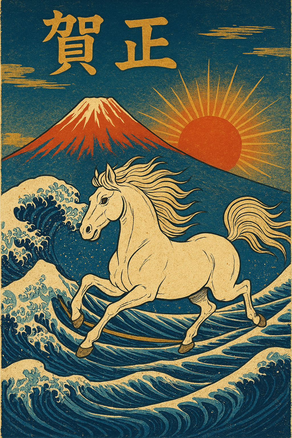 「2026年の年賀状デザイン。浮世絵スタイルで描いてください。背景には雄大な赤富士と初日の出。手前には、荒波のようなたてがみをなびかせて力強く駆ける白馬。葛飾北斎のような大胆な構図と、版画特有のカスレやテクスチャ。色彩は鮮やかな藍色と朱色を使い、アクセントに金色を入れてください。縦長のアスペクト比で。」