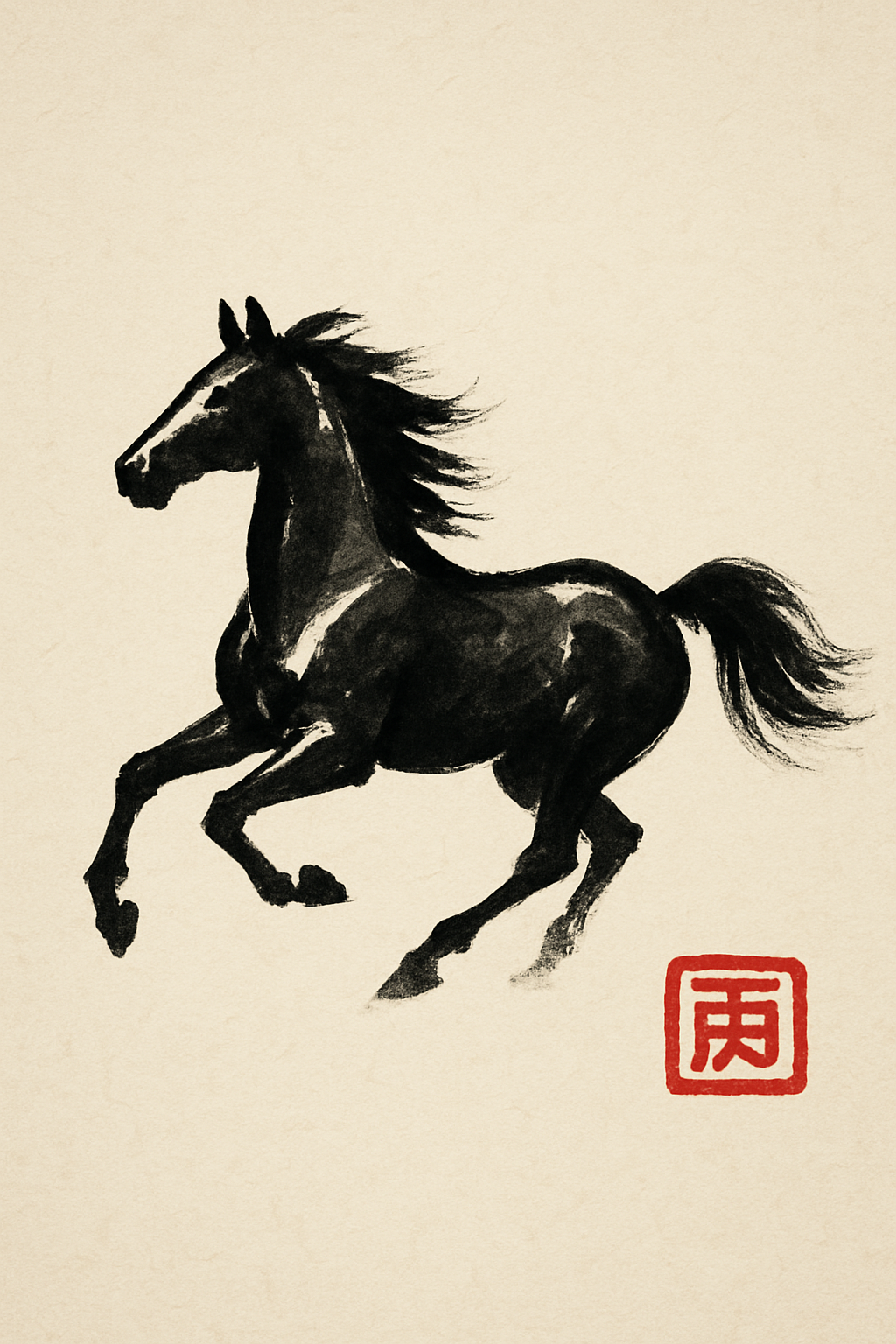 「水墨画(Sumi-e)スタイル。一筆書きで描かれたような、躍動感のある馬のシルエット。余白をたっぷりとった、禅(Zen)を感じさせるミニマルな構図。背景は生成りの和紙のテクスチャ。色は黒の濃淡のみで表現し、ワンポイントとして赤色の落款(ハンコ)風のデザインを入れてください。静寂と力強さ。縦長画像。」