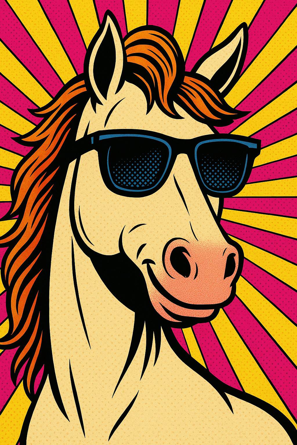 「ポップアートスタイルの年賀状デザイン。アメコミタッチで、サングラスをかけたクールな馬の顔のクローズアップ。背景は鮮やかな黄色とショッキングピンクの集中線とドット柄。エネルギッシュでユーモアのある雰囲気。縦長画像。」