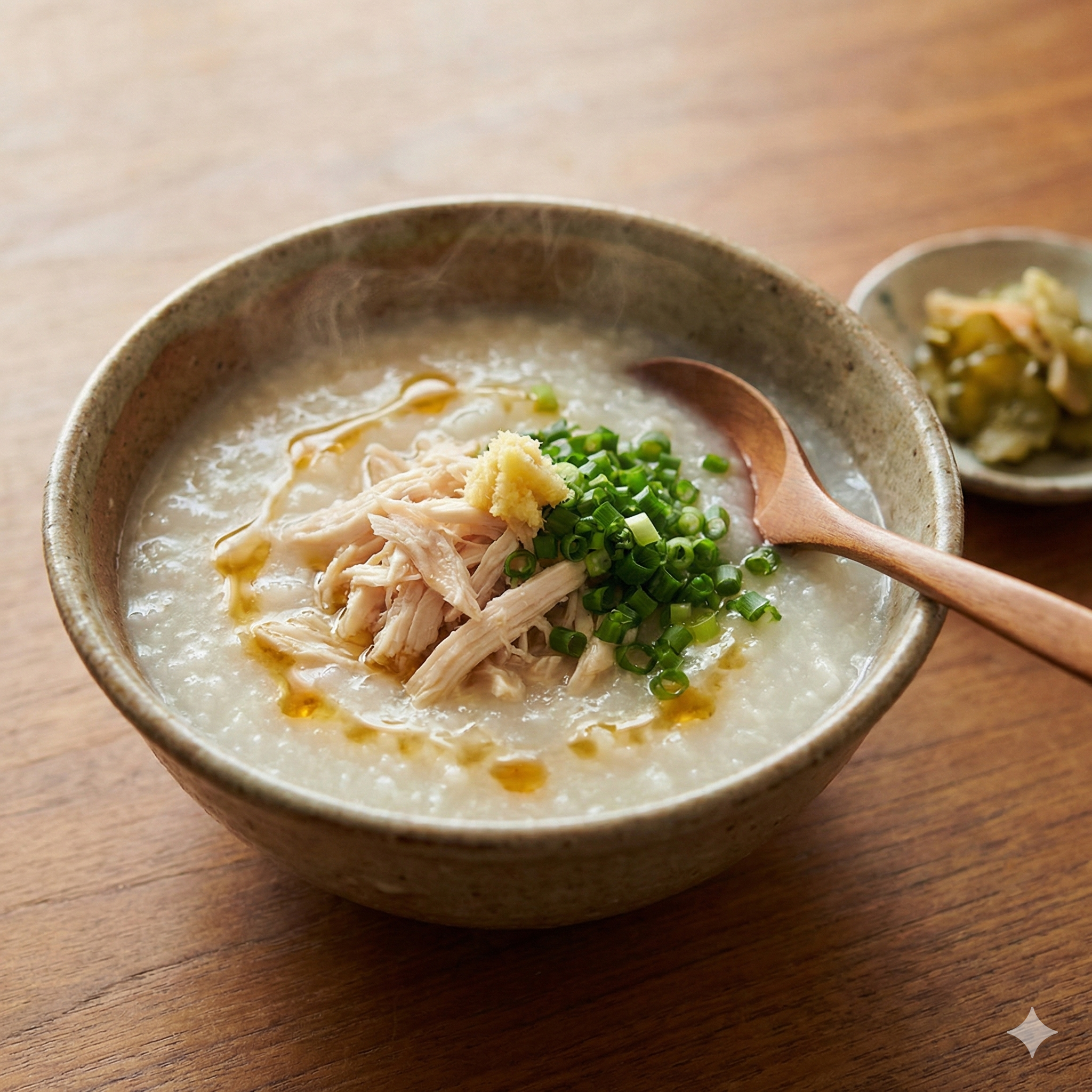淡白なお粥にタンパク質をプラスし、満足度を高めた一品です。ポイントは「鶏肉」と「ごま油」の活用です。