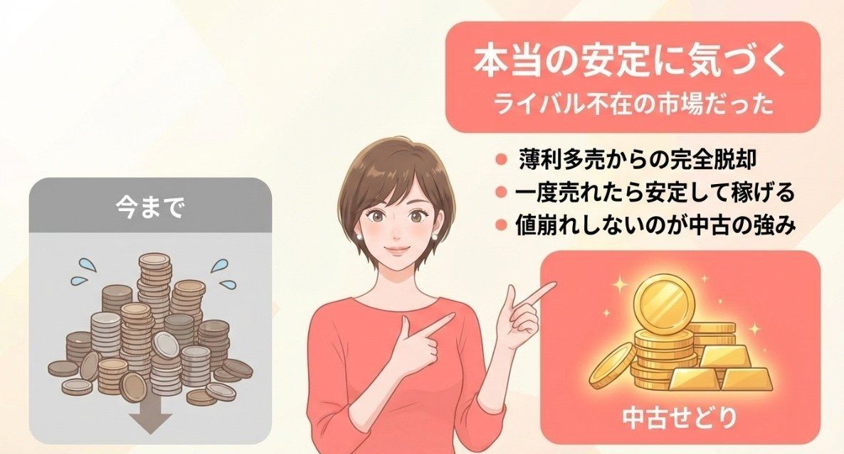 新品で100円、200円の利益を必死にかき集めていたのが嘘みたい。