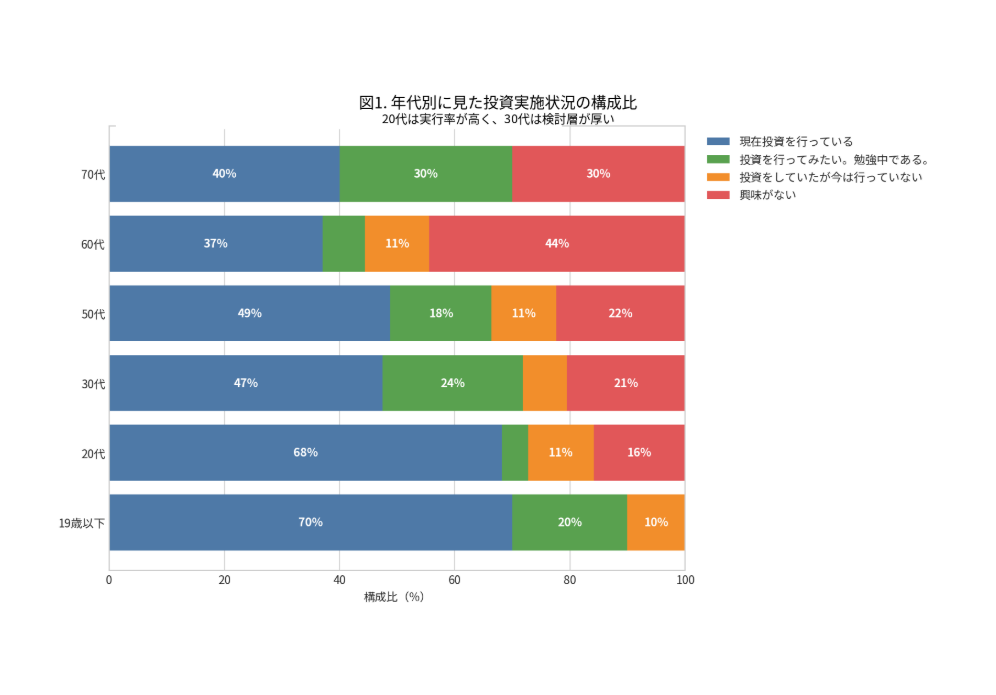 ここで重要なのは、図1が示しているのはあくまで投資実施状況の構成比であるという点である。したがって、この図だけから「慎重派」「積極派」といった心理特性を断定することはできない。一方で、年代によって投資との距離感が異なること、すなわち20代は実行率が高く、30代は検討層が厚く、60代では非関心比率が相対的に高い、という事実は明確に確認できる。