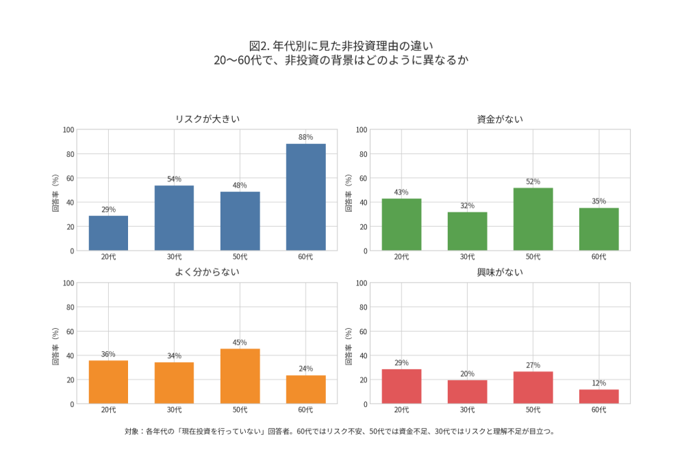 30代では、「リスクが大きい」と「よく分からない」が比較的高く、必要性を感じつつも、判断材料や安心材料が不足している構図が読み取れる。50代では「資金がない」が目立ち、生活設計の中で投資余力をどう確保するかが課題になっている可能性がある。60代では「リスクが大きい」が高く、投資をしない背景として損失回避意識が強く働いていることがうかがえる。つまり、同じ「投資していない」状態でも、年代によって障壁の中身は異なっている。これらの差は図2で確認できる。