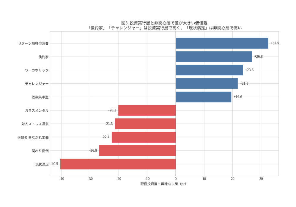 この結果から、投資実行層は単に支出余力がある層というより、節度を保ちながら、期待値のある行動には前向きに踏み出す傾向を持つことが示唆される。一方、非関心層では、現状維持志向や心理的負荷回避の傾向が比較的強く表れている。図1では、両者の差が大きい価値観項目を可視化している。